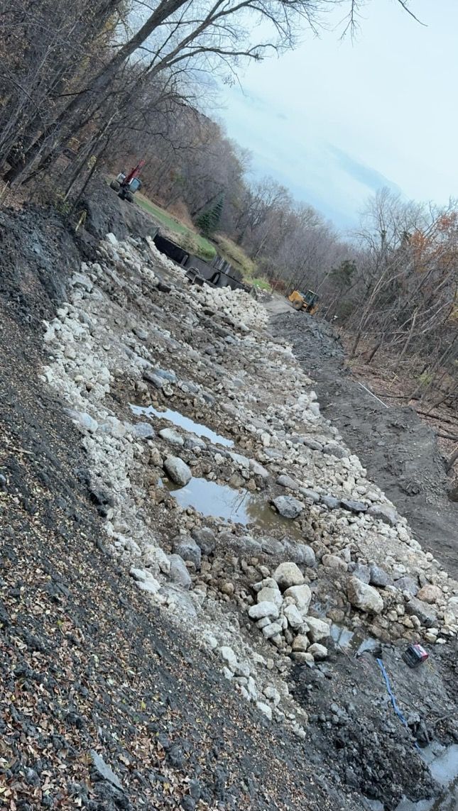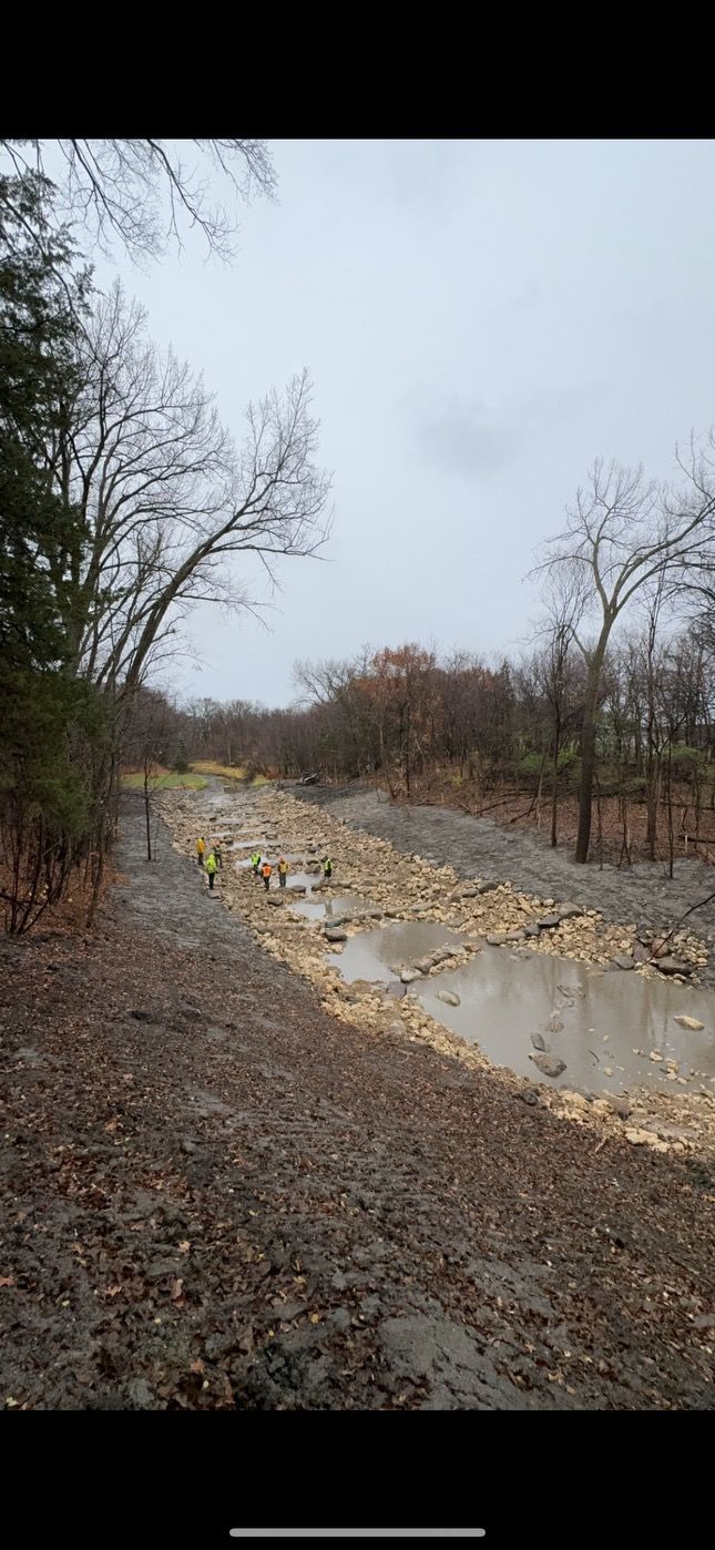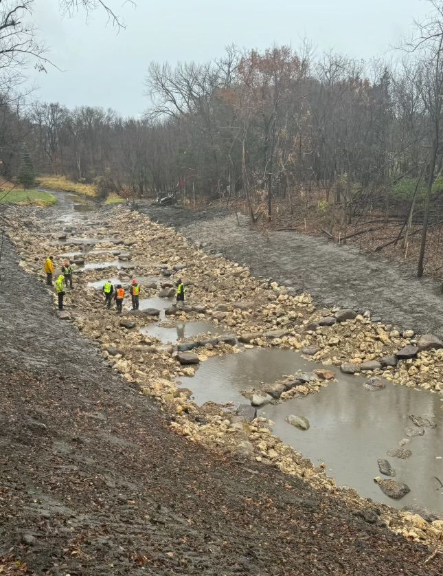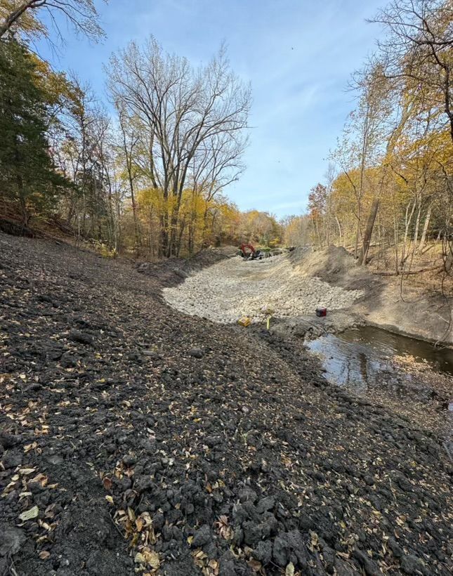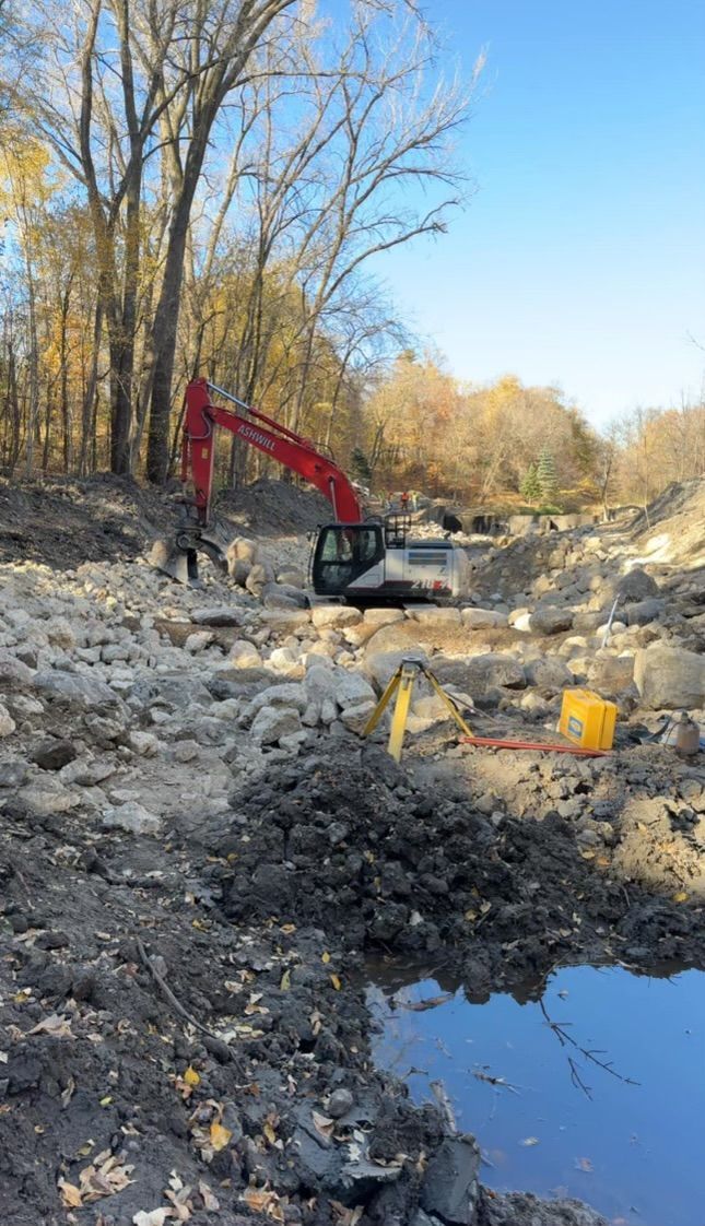 Ashwill Companies received the opportunity to complete a dam modification project on Seven Mile Creek through Nicollet County Soil and Water Conservation District. The project consisted of clearing and grubbing vegetation, removal of existing portions of the dam, regrading the banks and creek bottom, installing various sizes of boulders and rip rap, erosion control and seeding in order to create a new arch rapids.